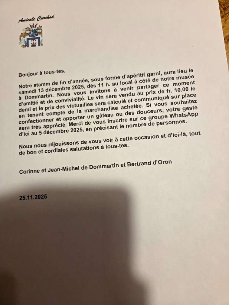 STAMM de Noël 2025 à Dommartin le 13 décembre dès 11 h au muséeInscrivez-vous au plus tard le 5 décembre auprès de Bertrand, Corinne ou Jean-Michel