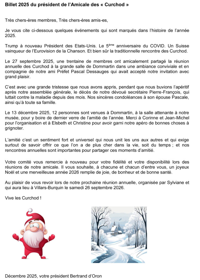 Vive les Curchod, et je me réjouis de retrouver un bon nombre d’entre vous à notre premier stamm du 27 octobre à Dommartin.